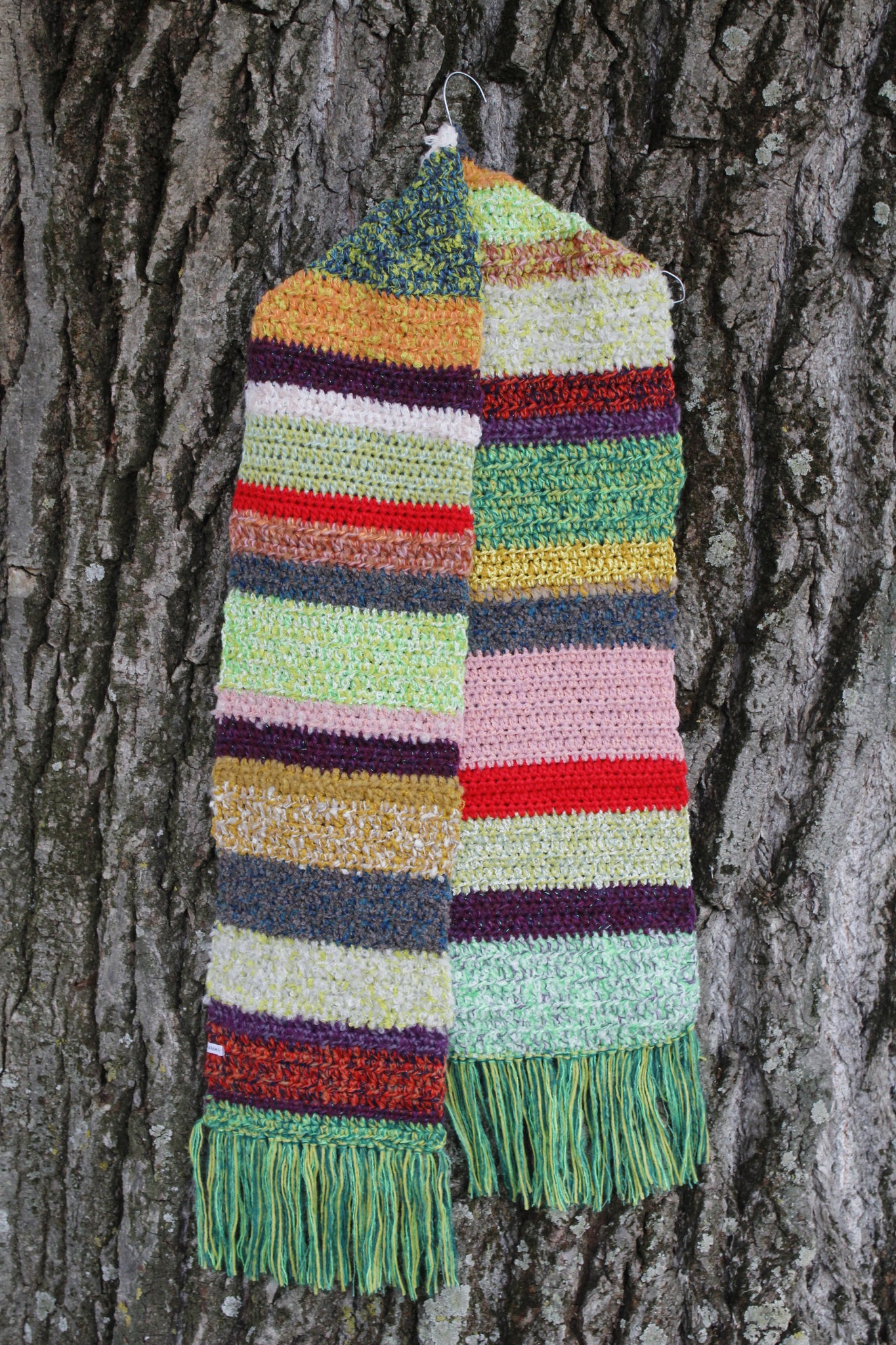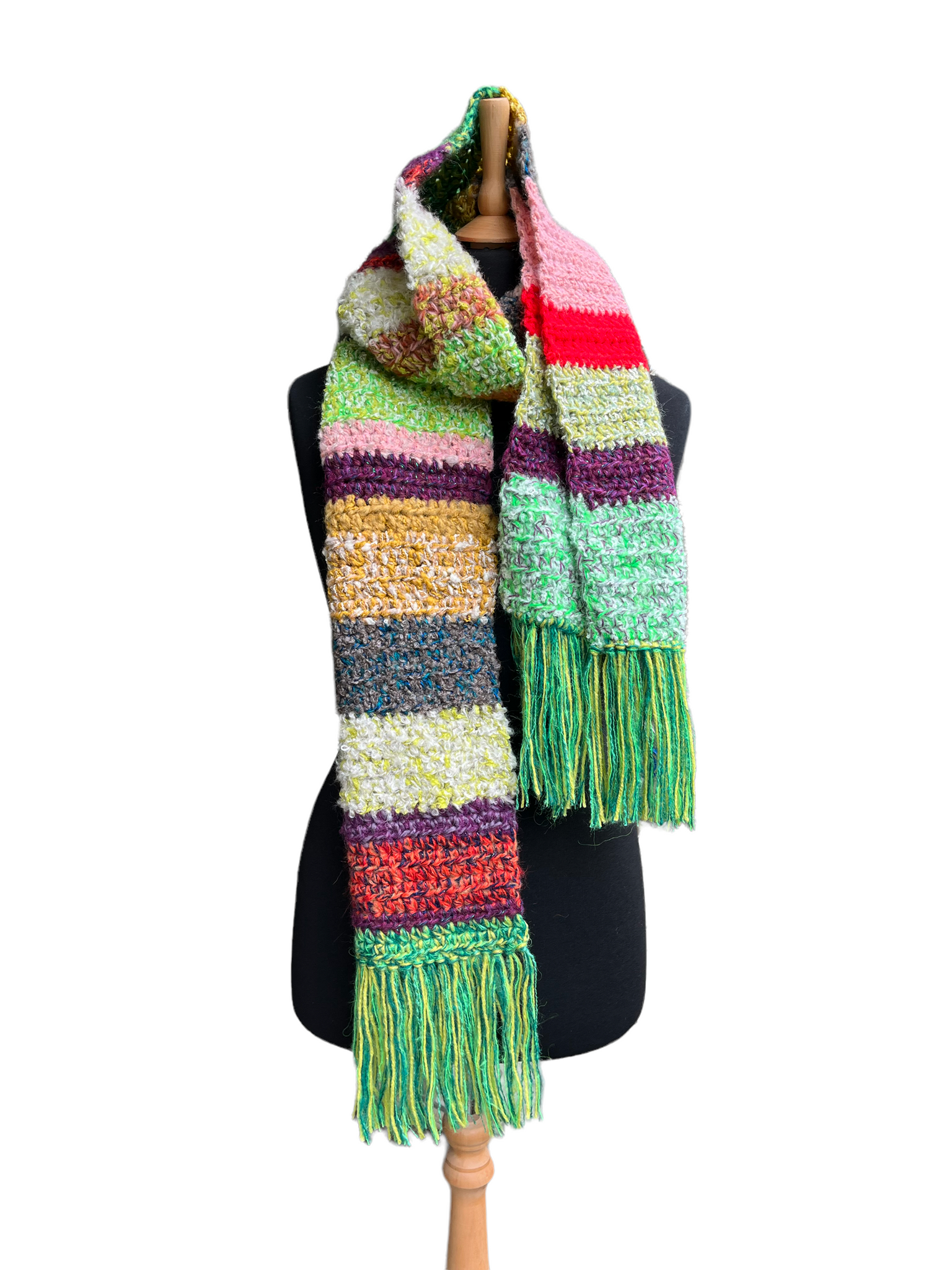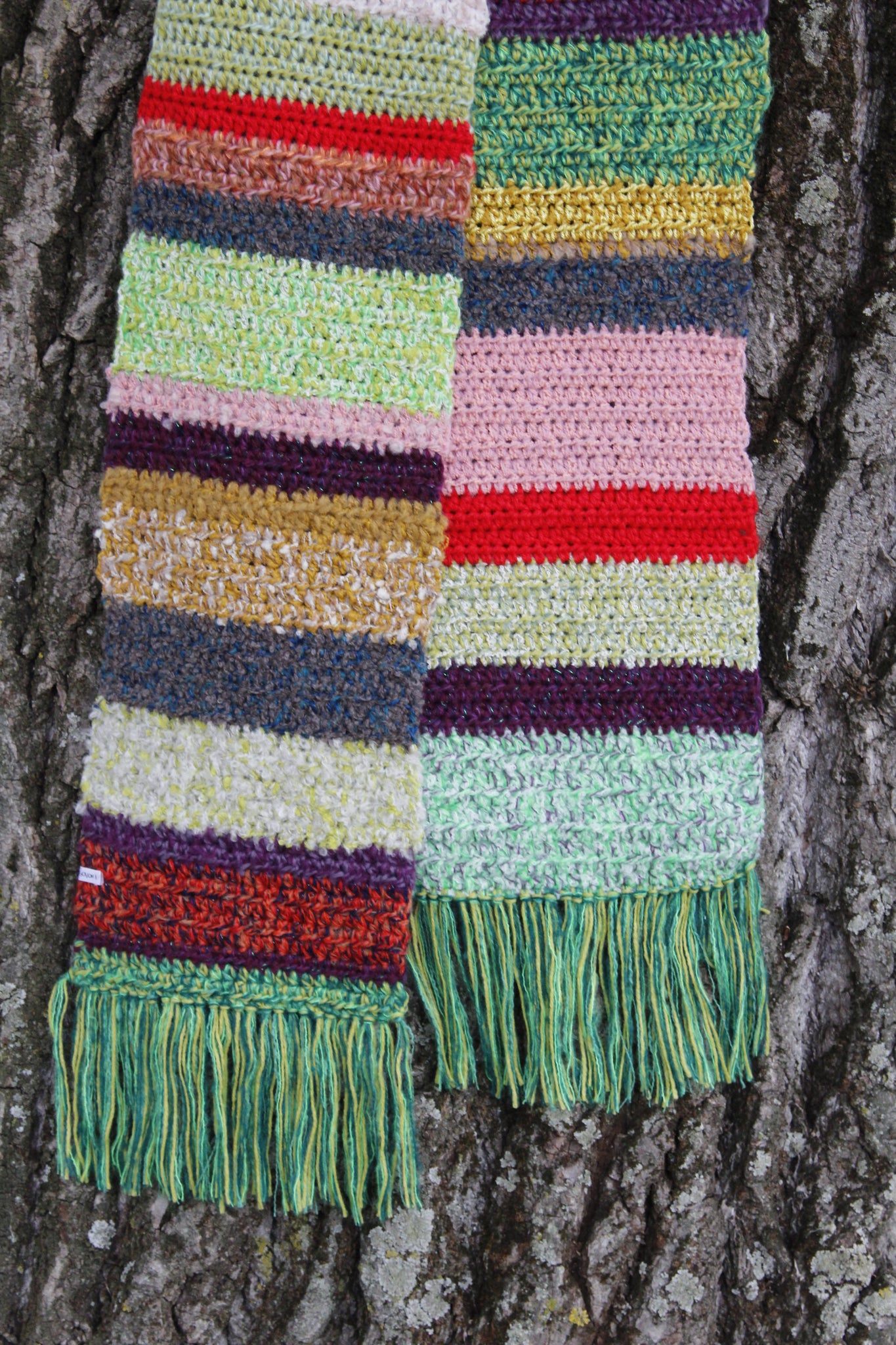 Sciarpa in lana fatta a mano a uncinetto con lavorazione a righe colorate.