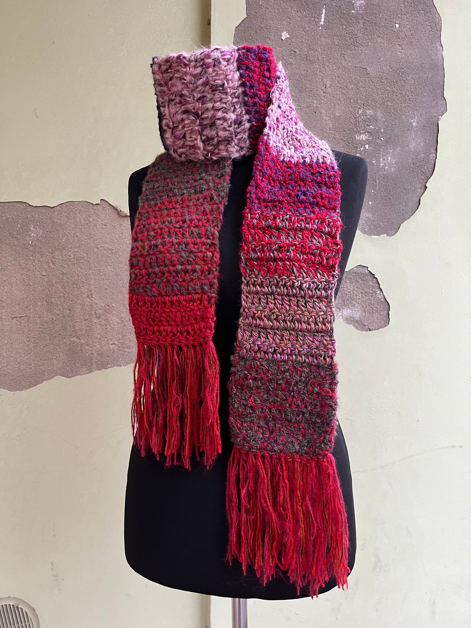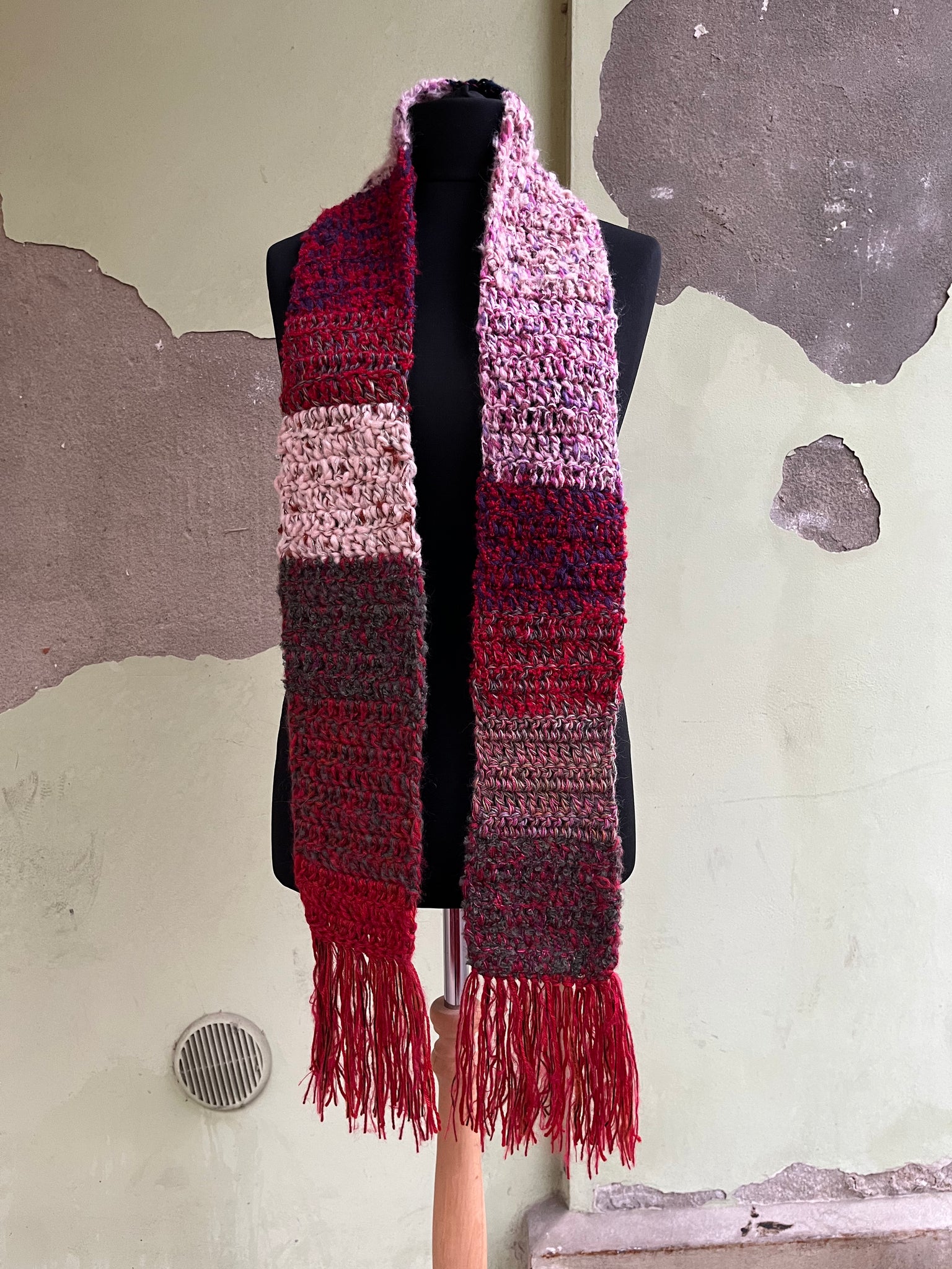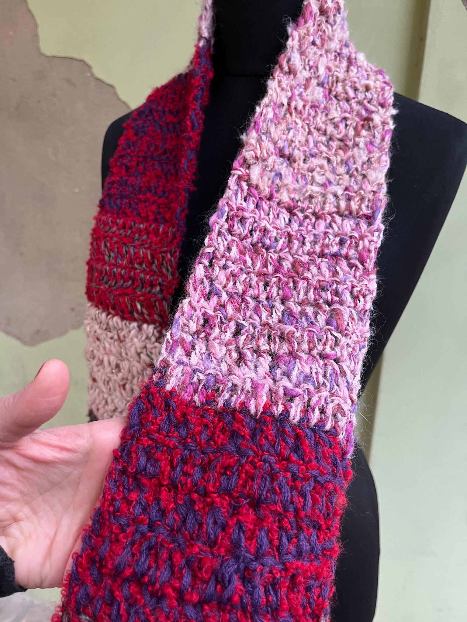 Sciarpa in lana fatta a mano a uncinetto con lavorazione a righe colorate, frangia e inserti in lurex.