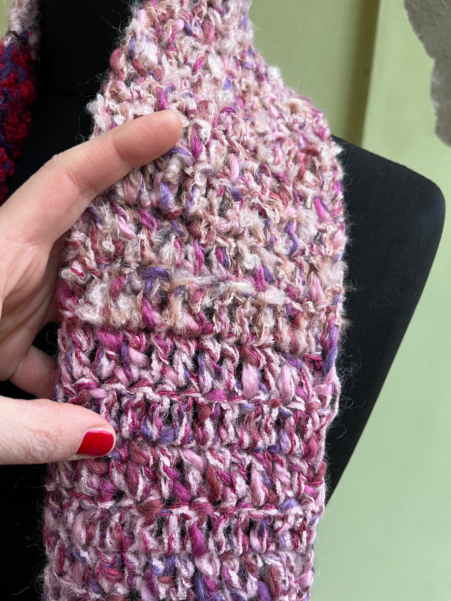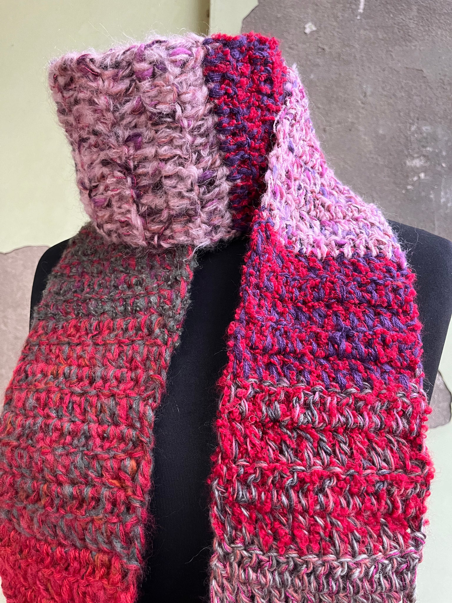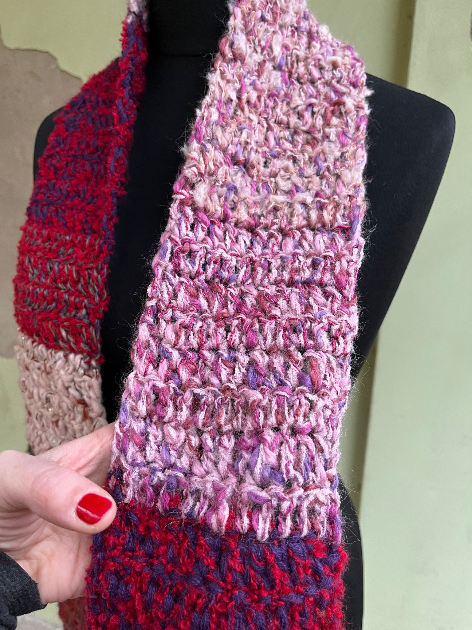 Sciarpa in lana fatta a mano a uncinetto con lavorazione a righe colorate, frangia e inserti in lurex.