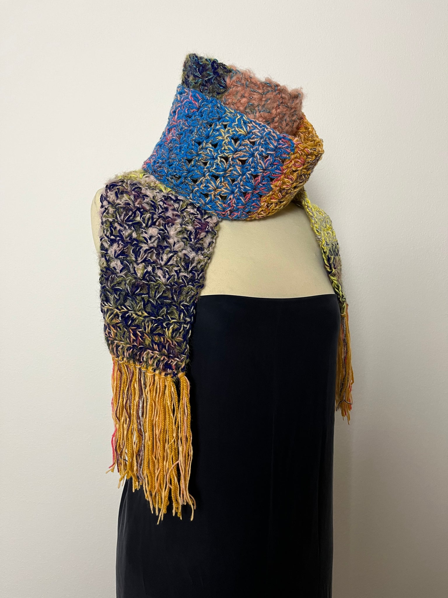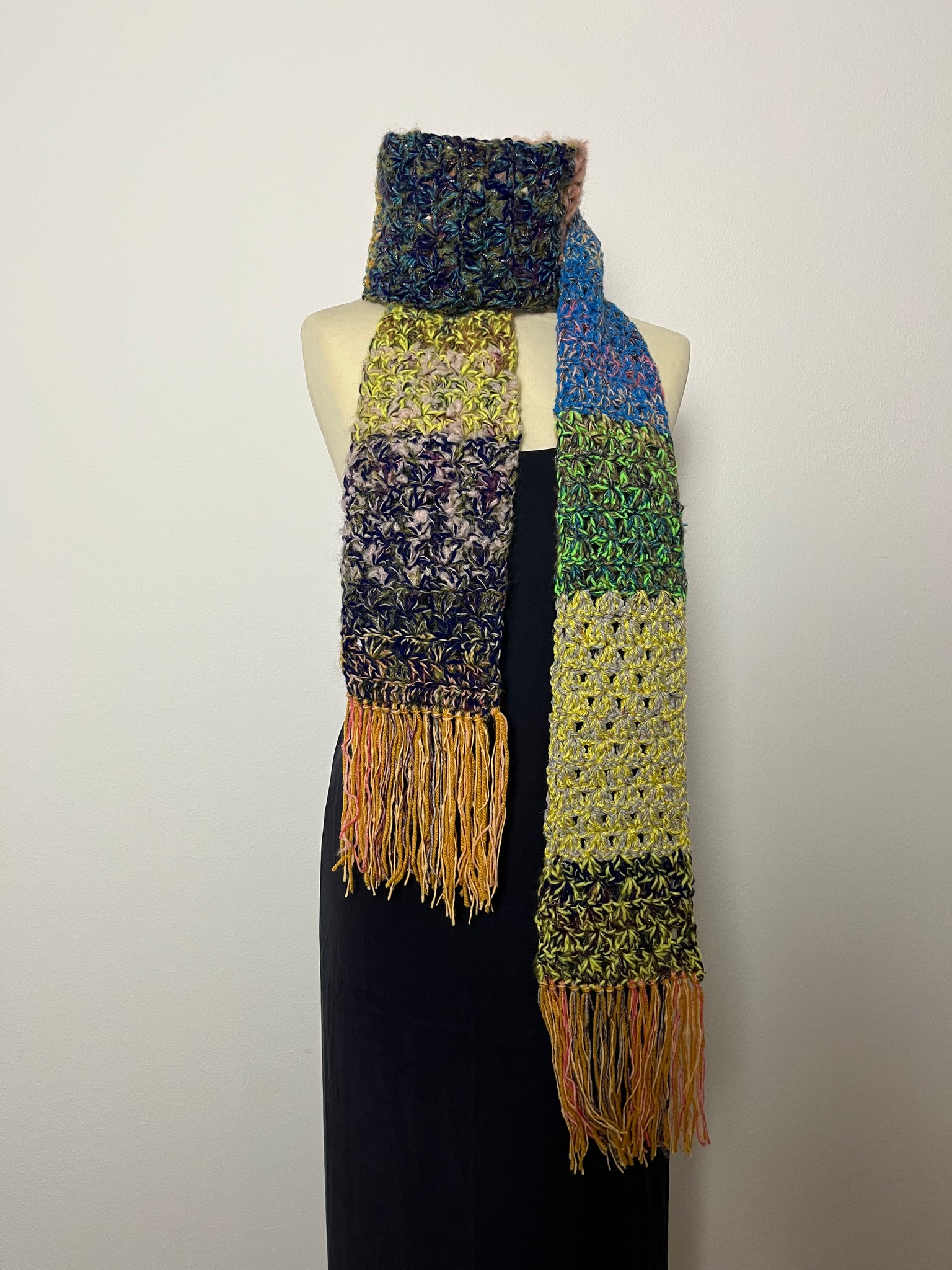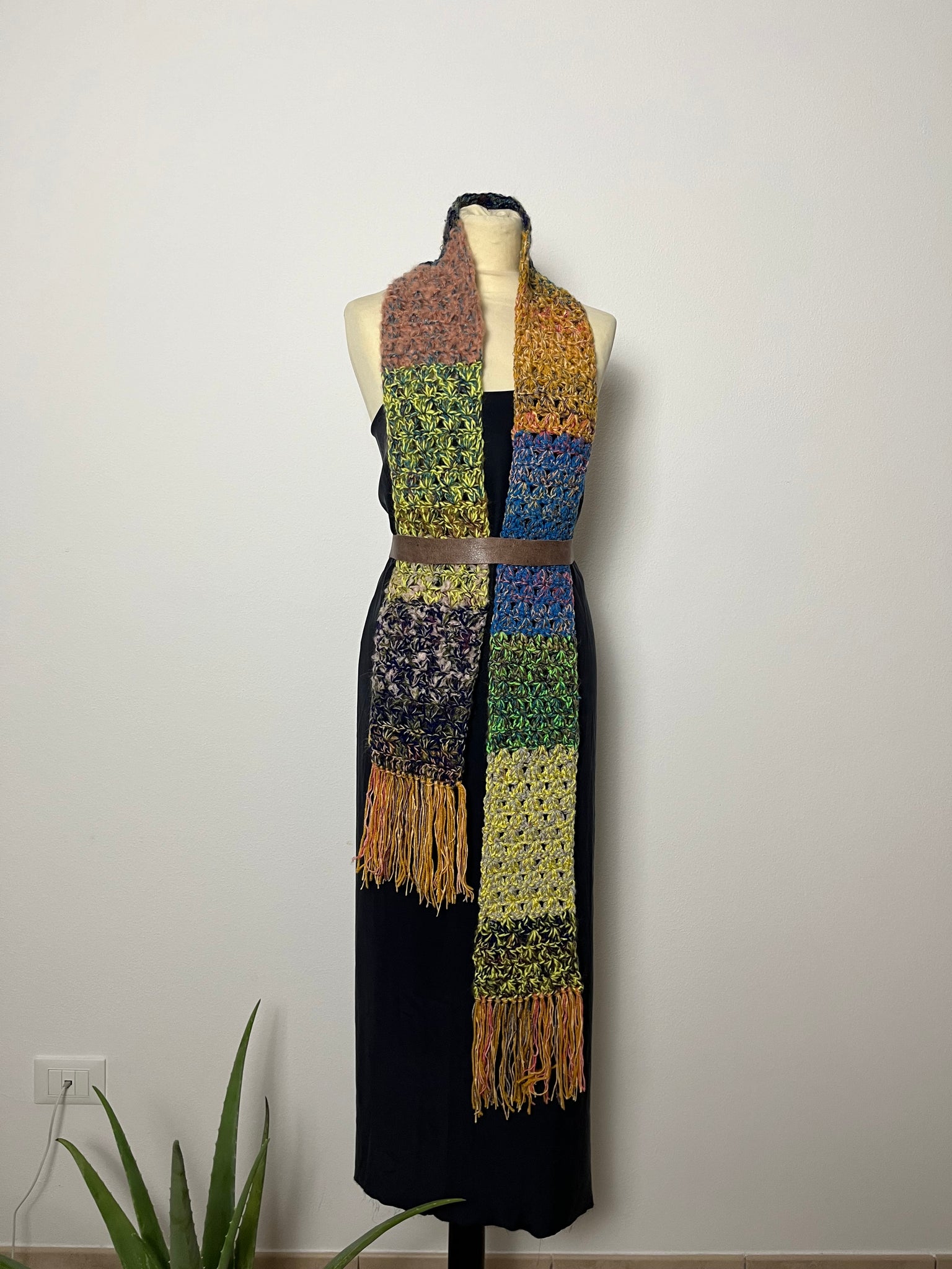 Sciarpa in lana fatta a mano a uncinetto con lavorazione a righe colorate, frangia e inserti in lurex.