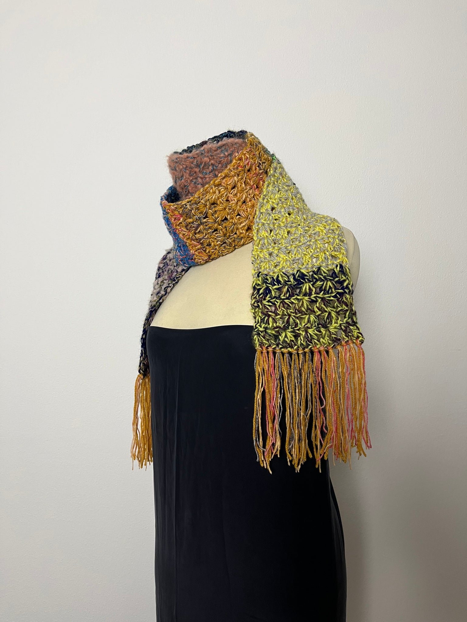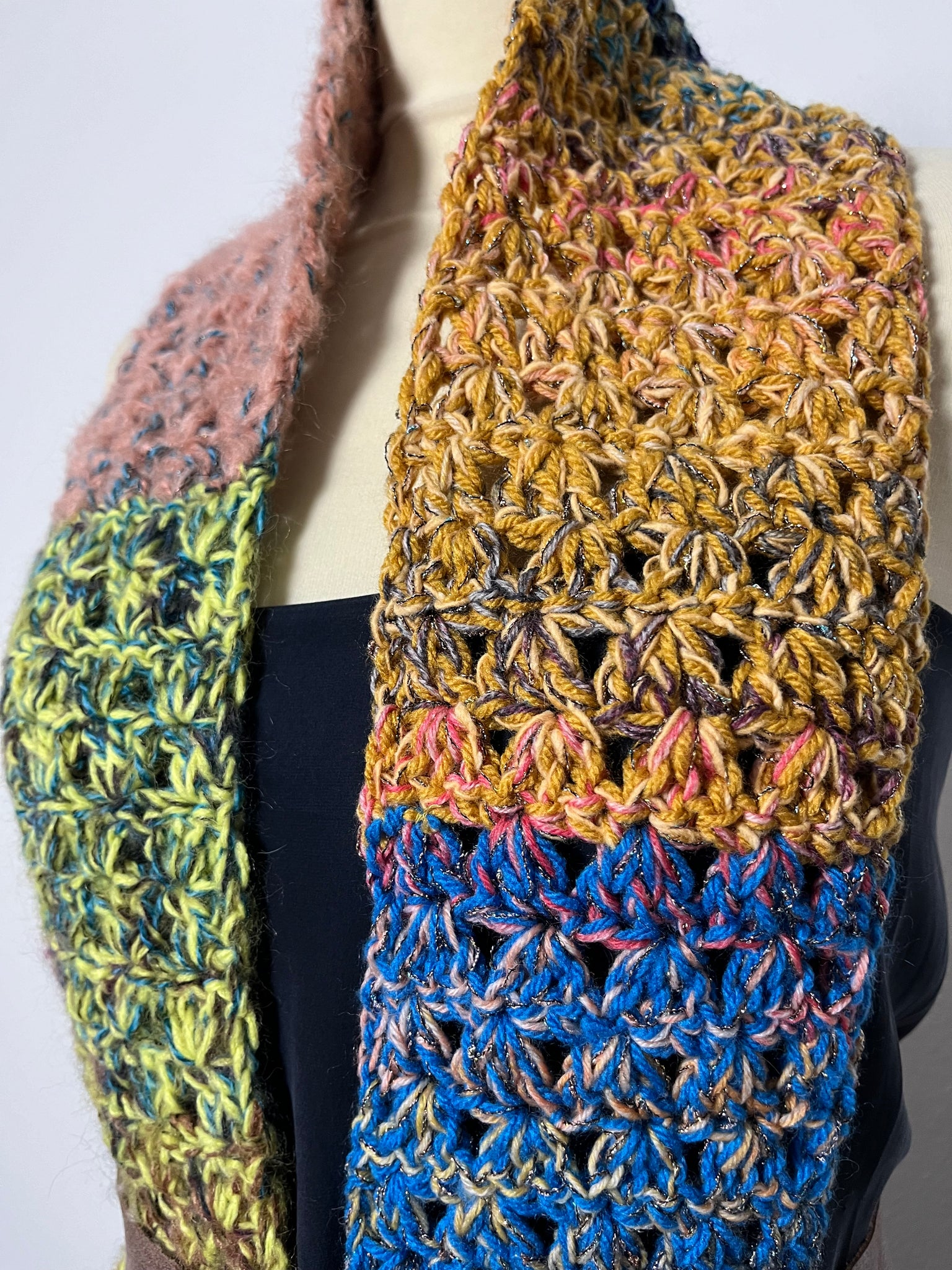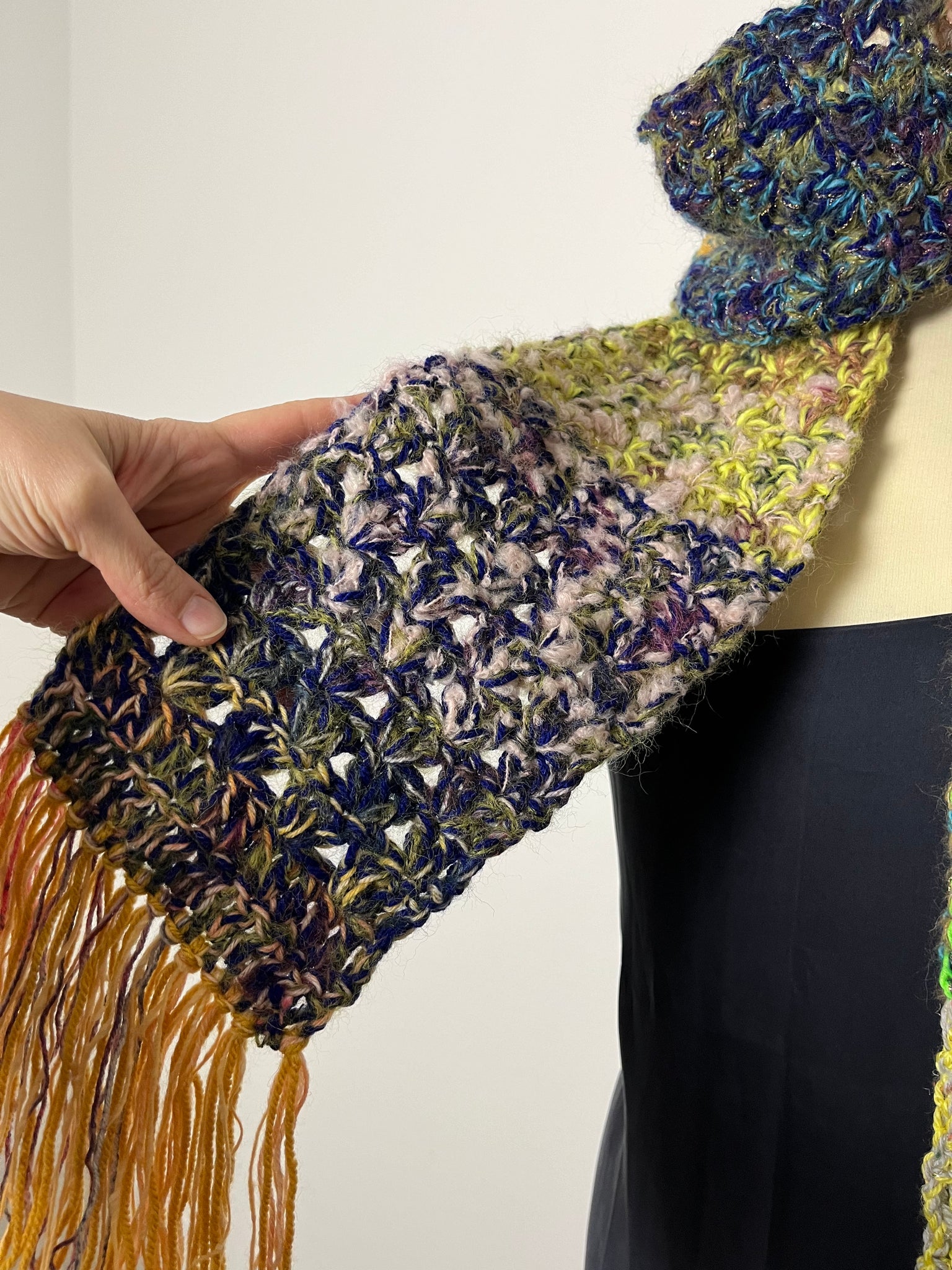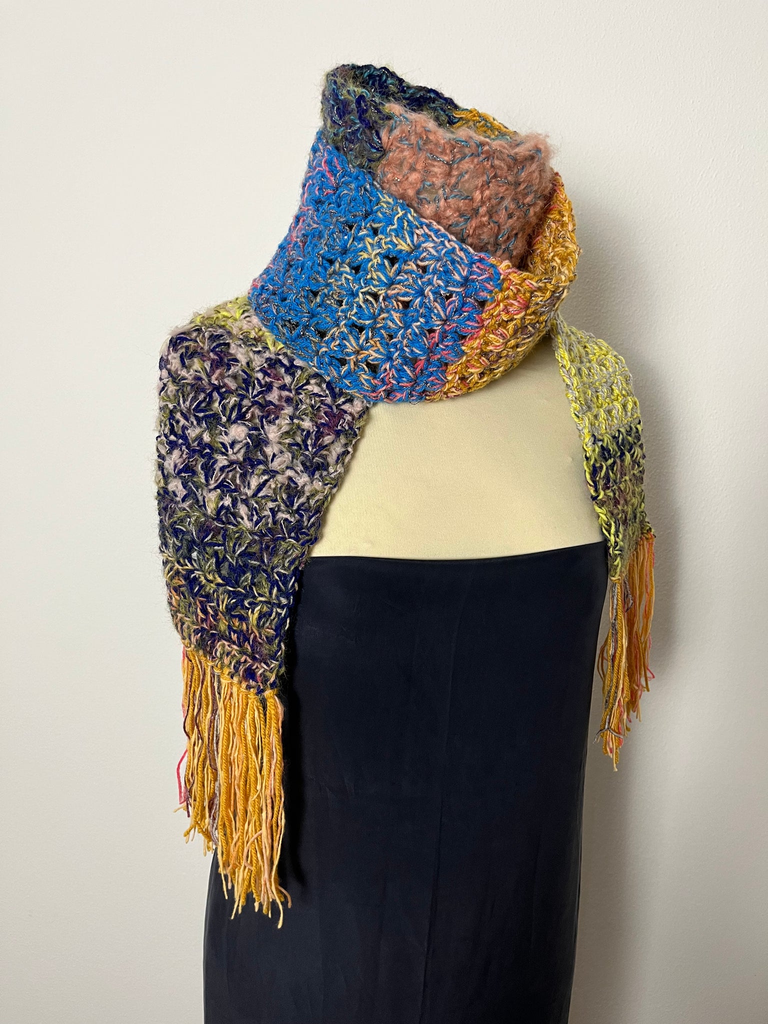 Sciarpa in lana fatta a mano a uncinetto con lavorazione a righe colorate, frangia e inserti in lurex.