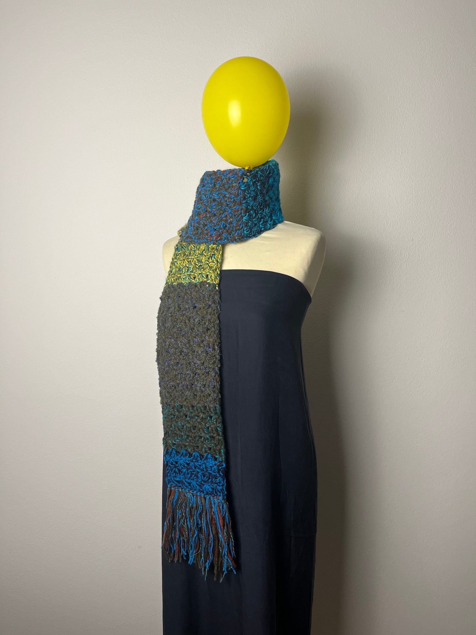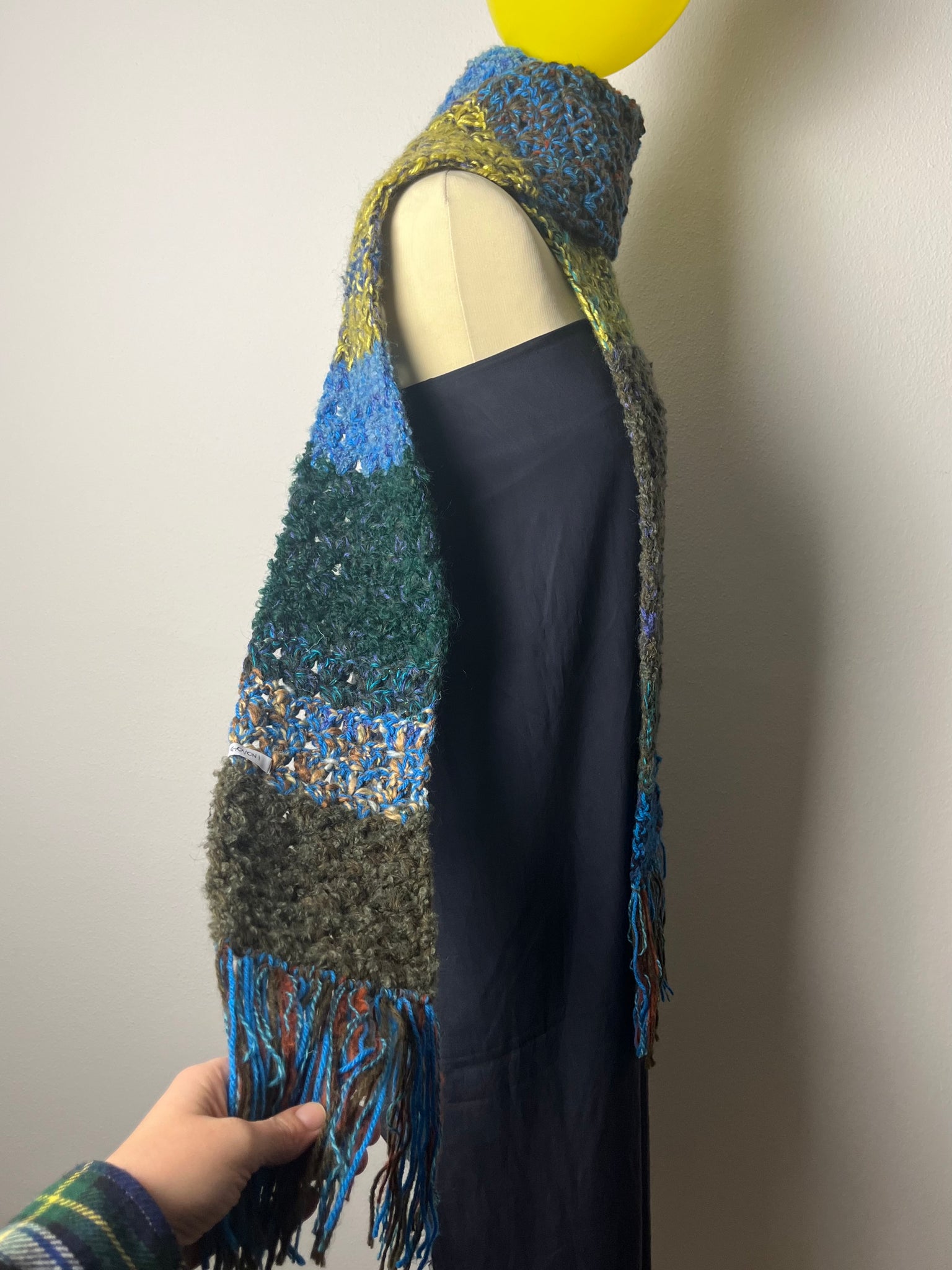 Sciarpa in lana fatta a mano a uncinetto con lavorazione a righe colorate, frangia e inserti in lurex.
