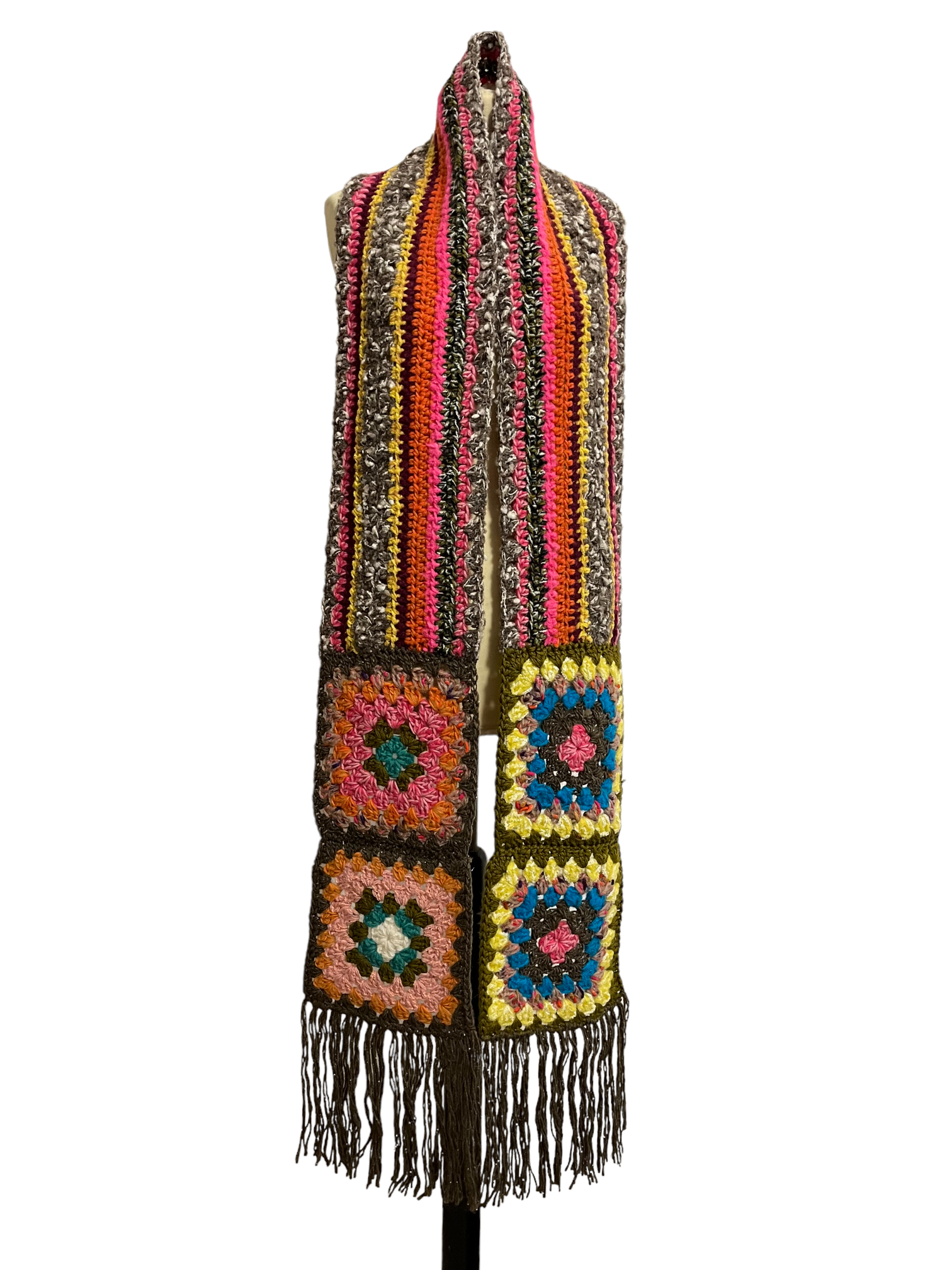 Sciarpa in lana fatta a mano a uncinetto con lavorazione a righe colorate e quadri alle estremità.