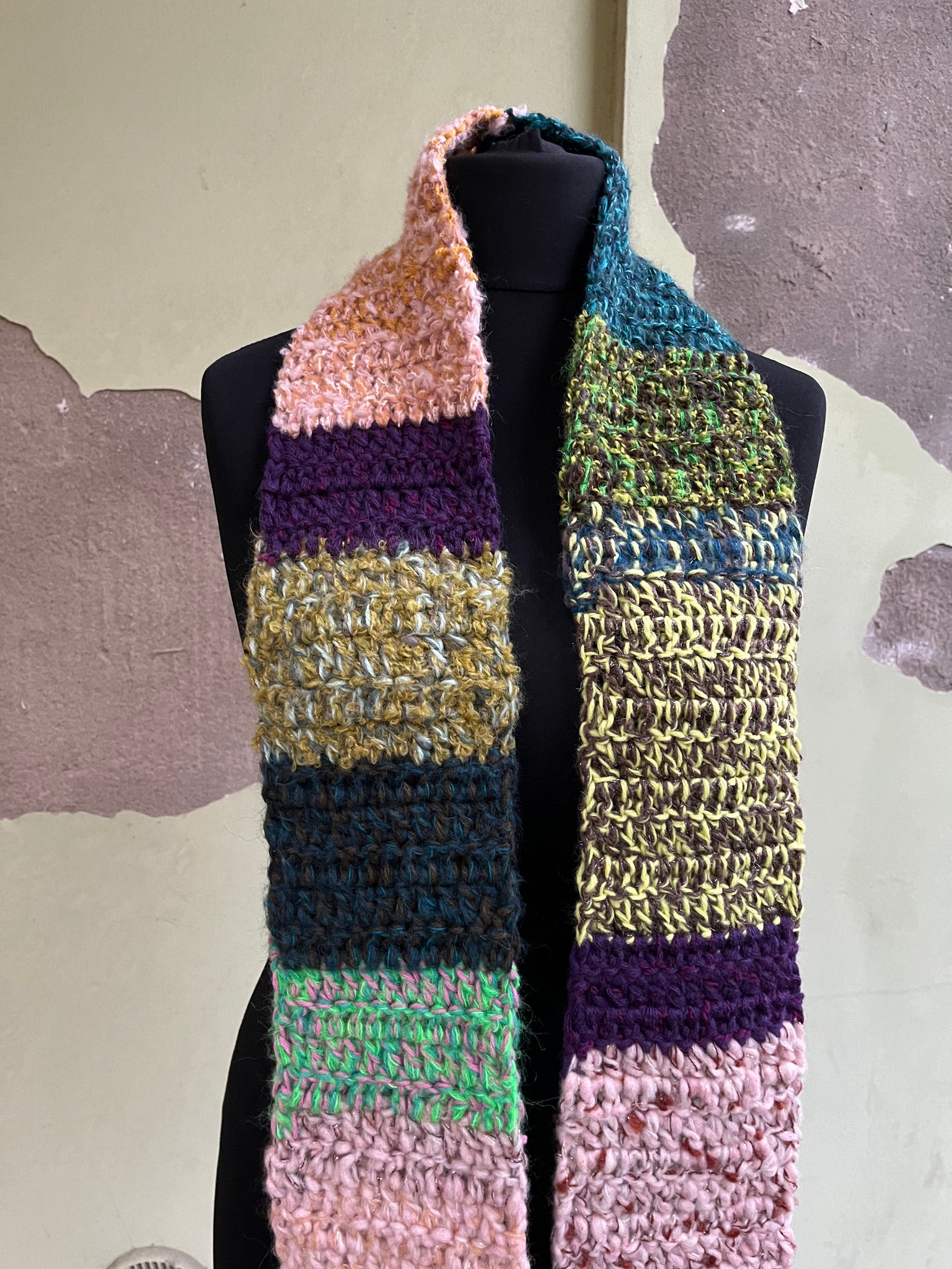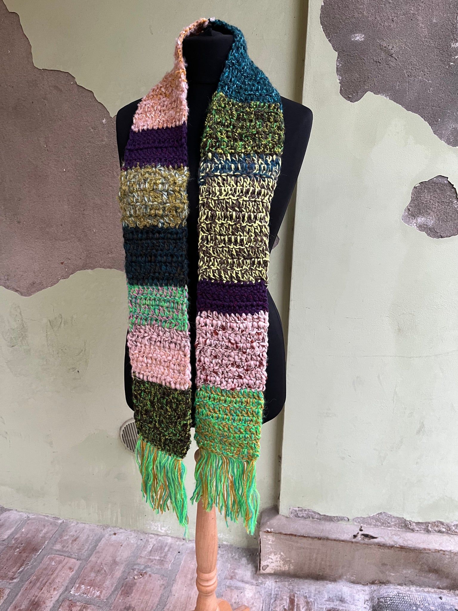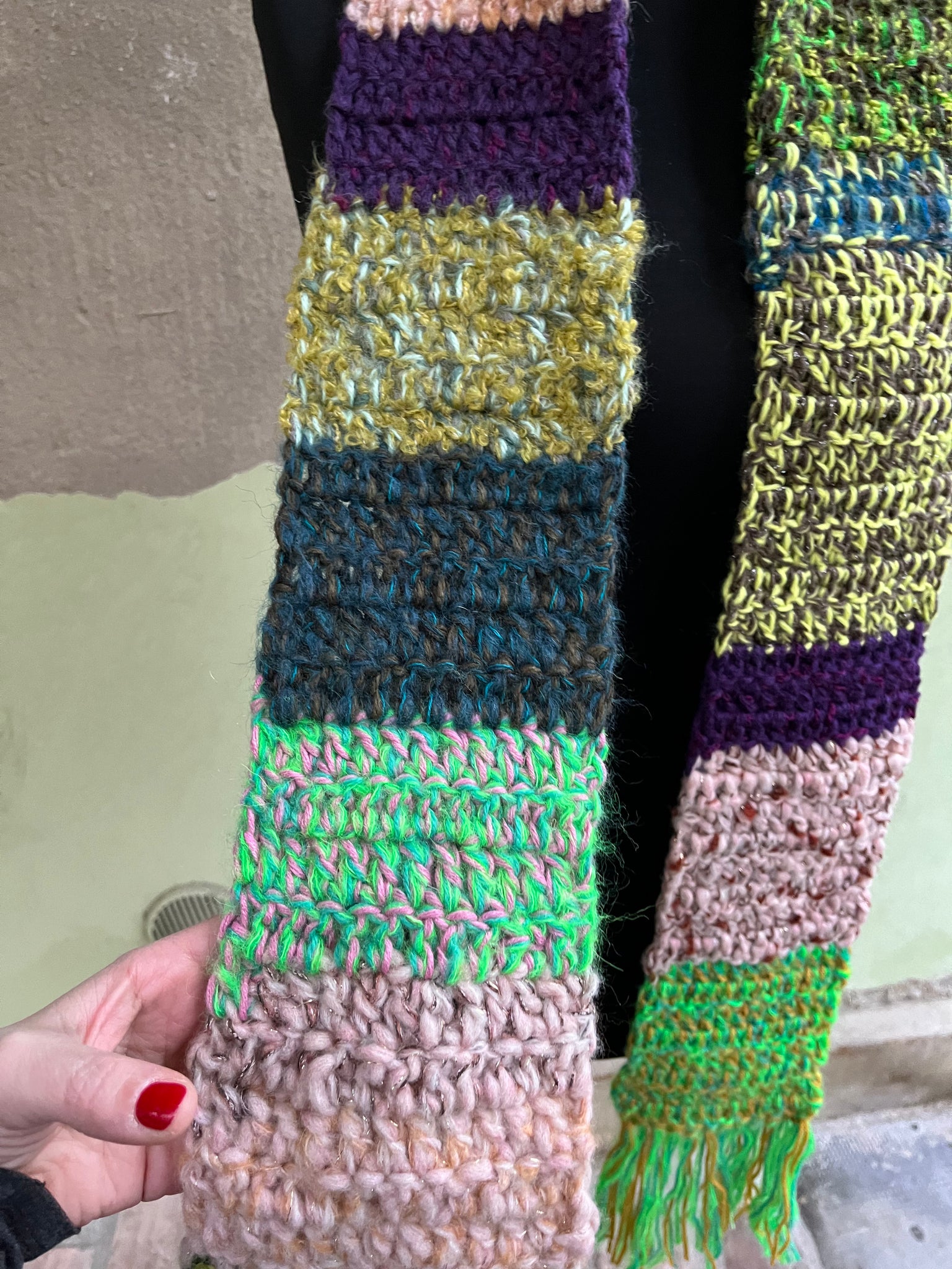 Sciarpa in lana fatta a mano a uncinetto con lavorazione a righe colorate, frangia e inserti in lurex.