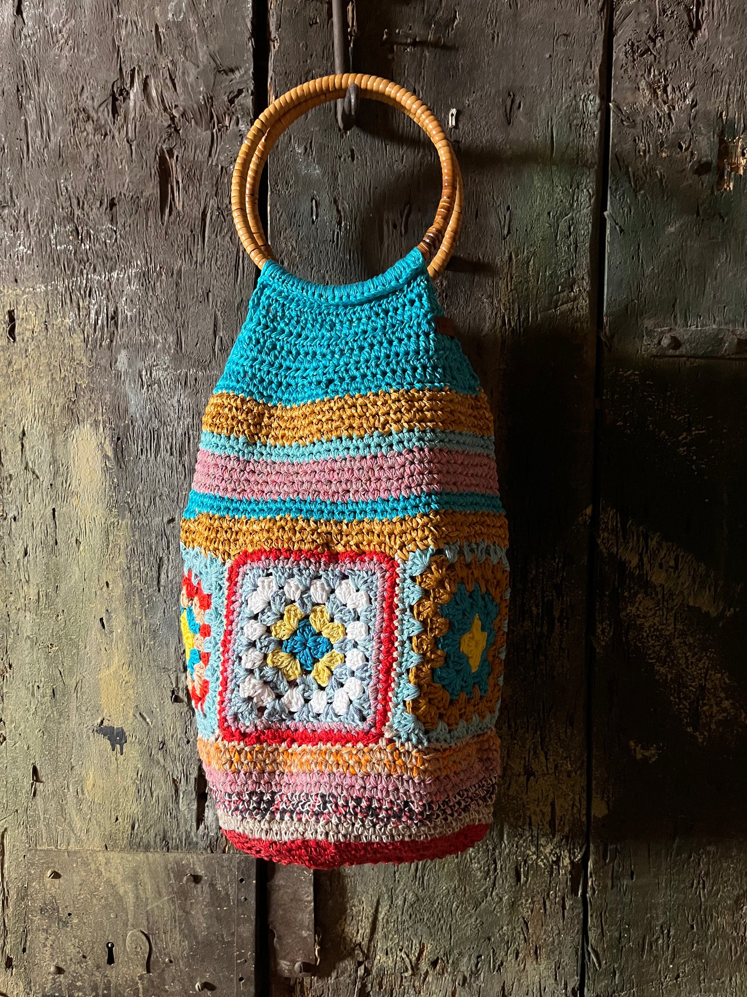 Borsa a secchiello fatta a mano a uncinetto in cotone e rafia. Manici tondi in vimini.