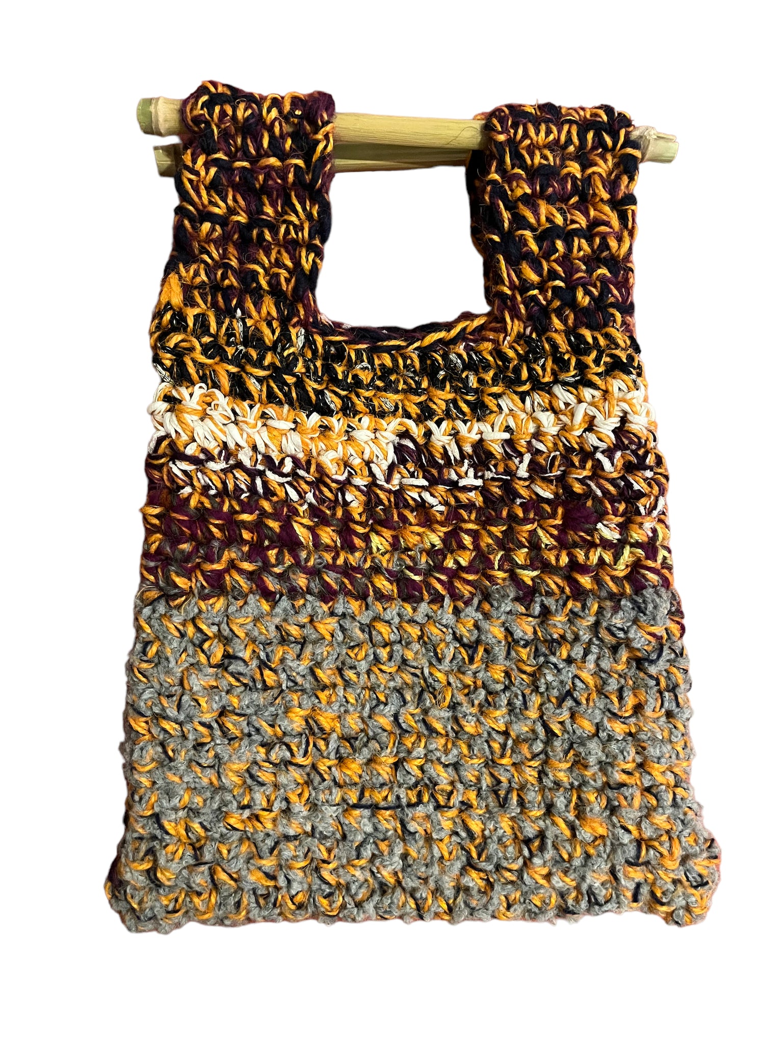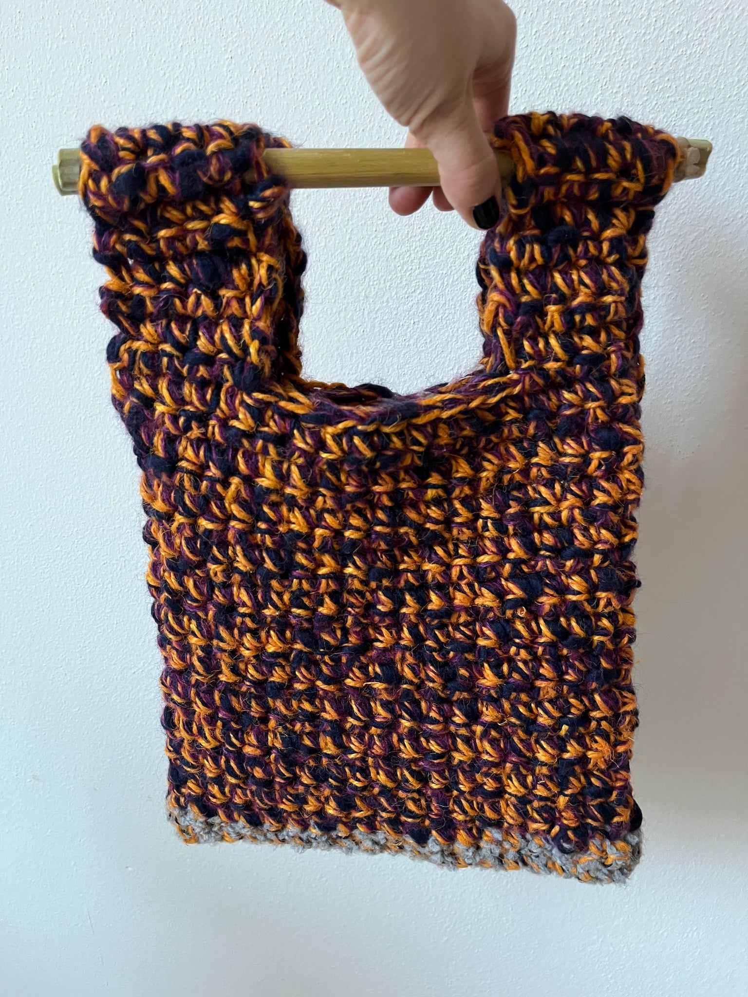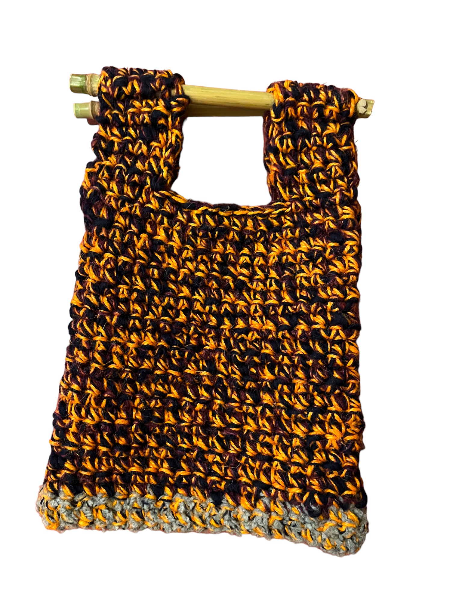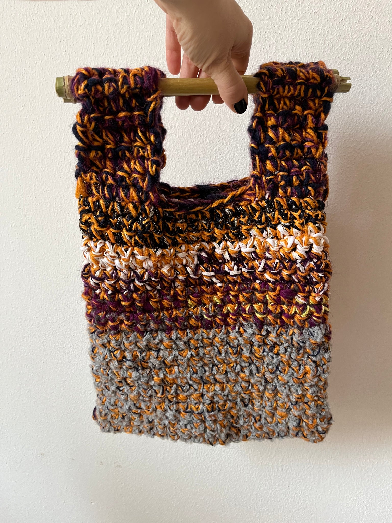 Borsa con sacca lavorata a uncinetto in juta naturale e lana. Manici in bambù del Bosco Integrale che si trova a Cento, Ferrara, opportunamente scelto, tagliato e trattato.