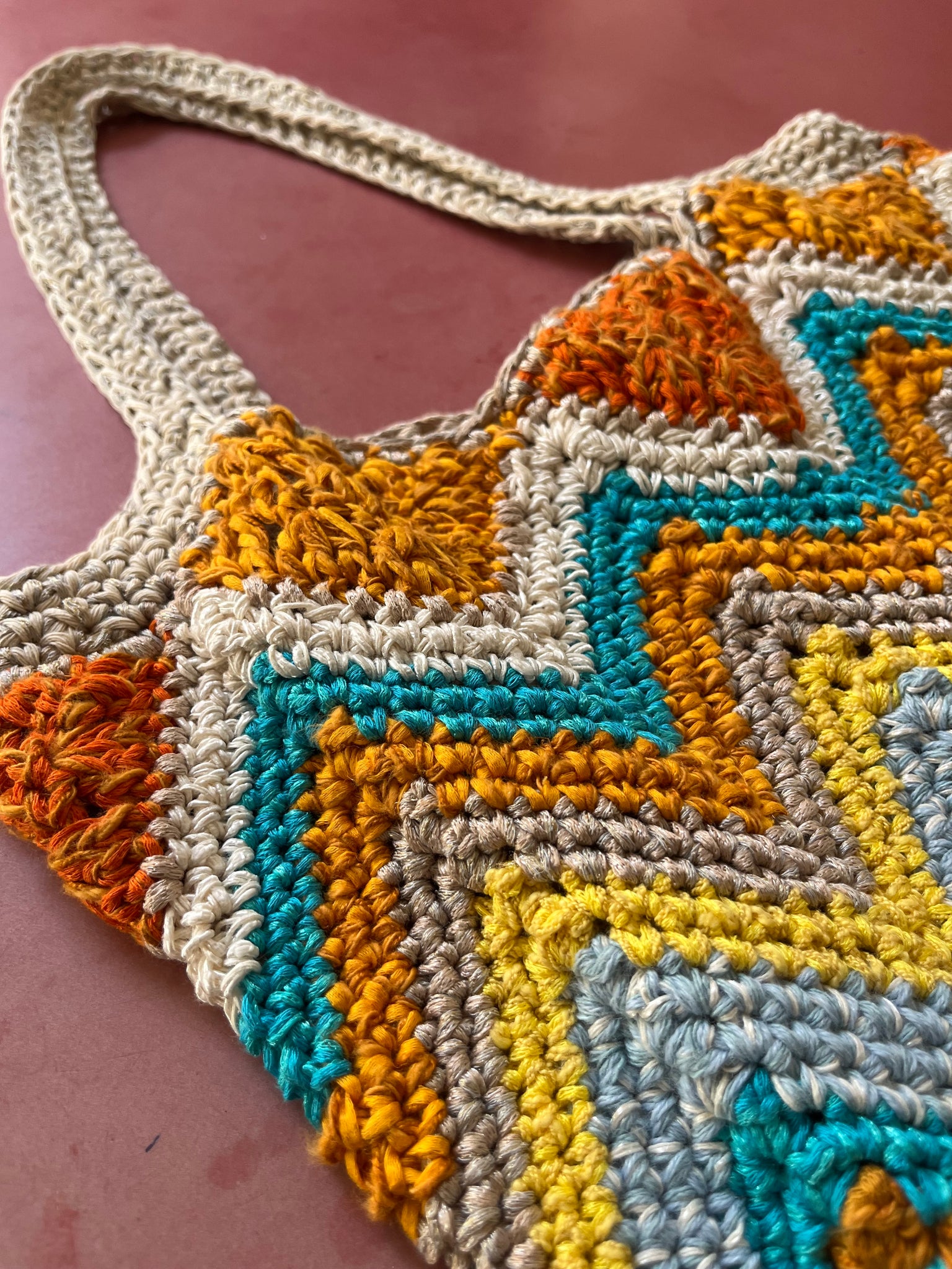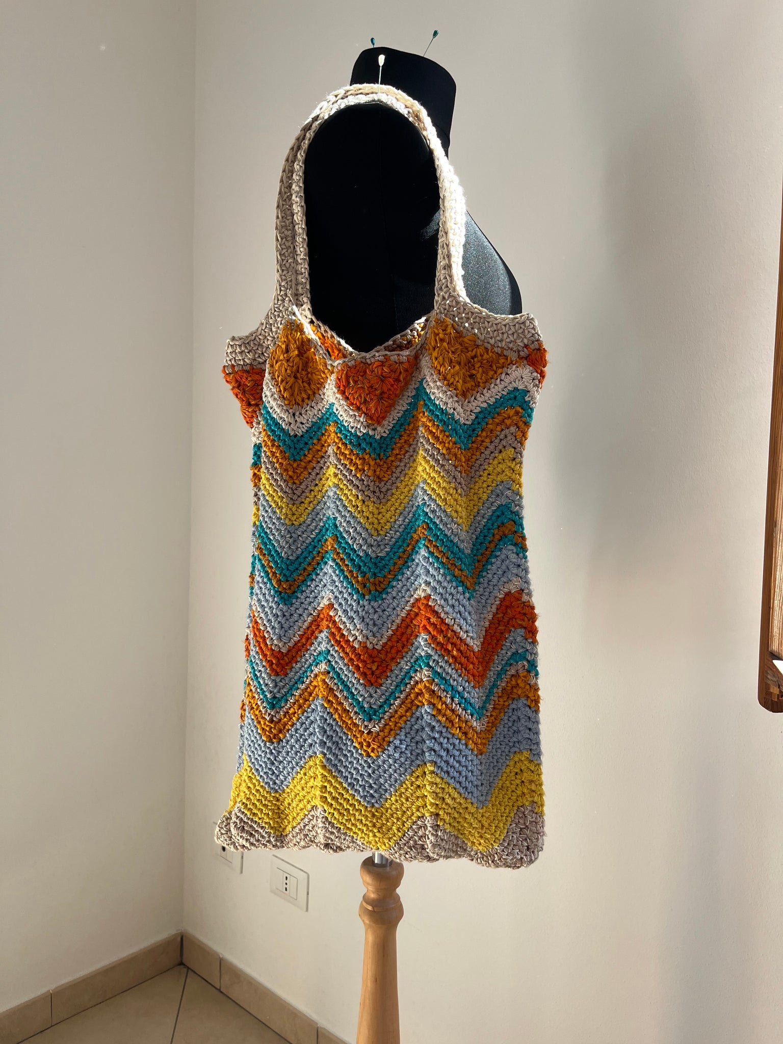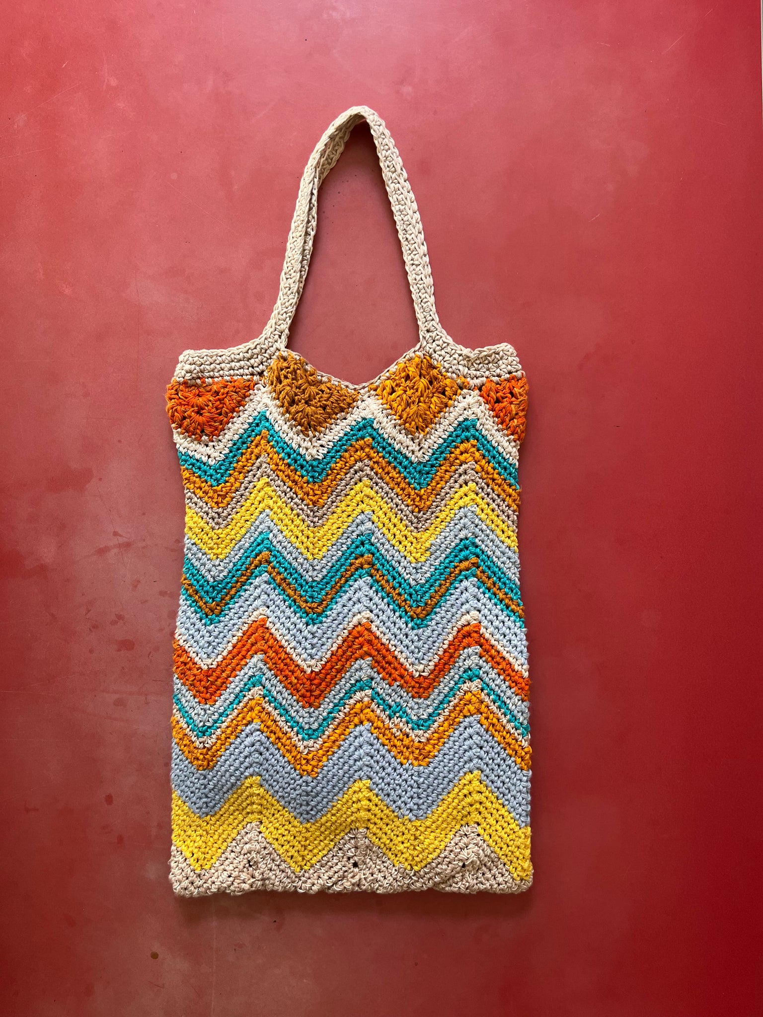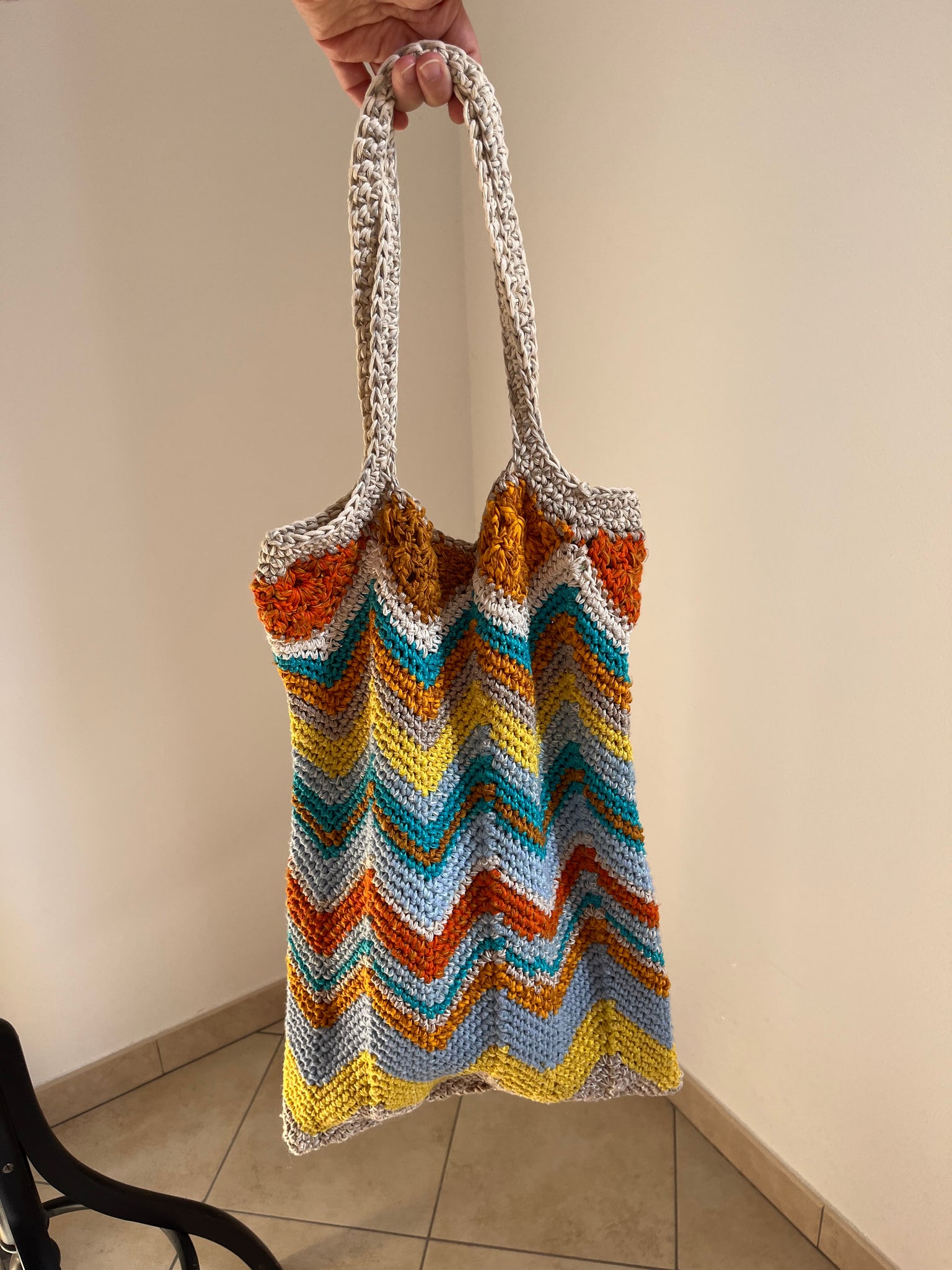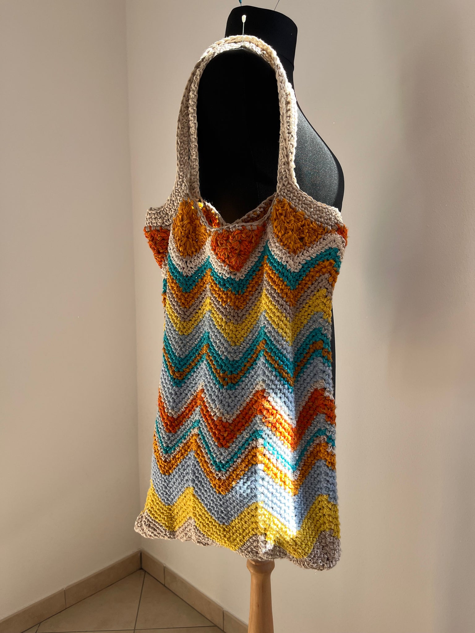 Borsa shopper fatta mano a uncinetto in cotone nelle tonalità del celeste, arancio e giallo con base e manici in beige. Manici a spalla e lavorazione a righe zig zag.