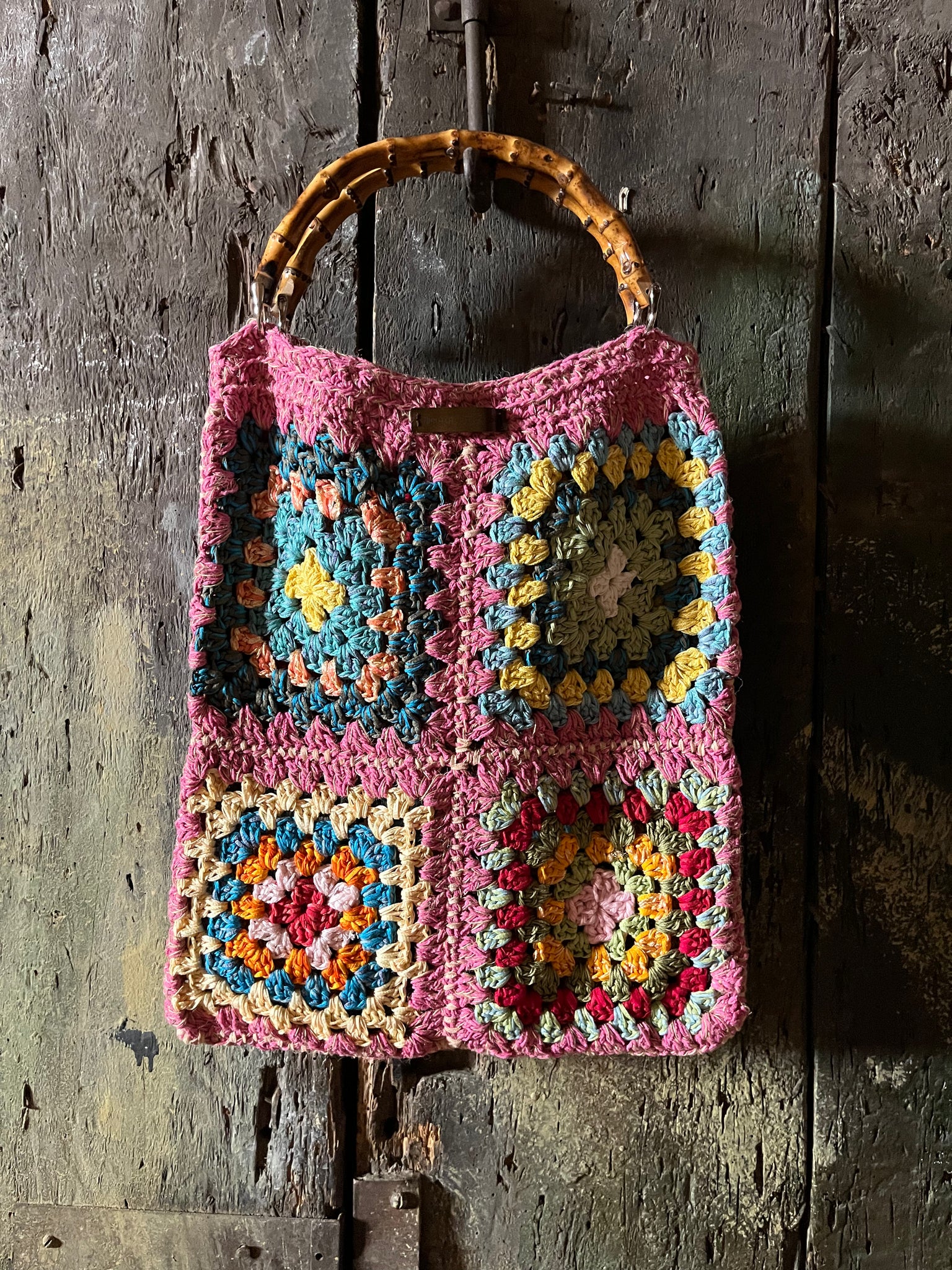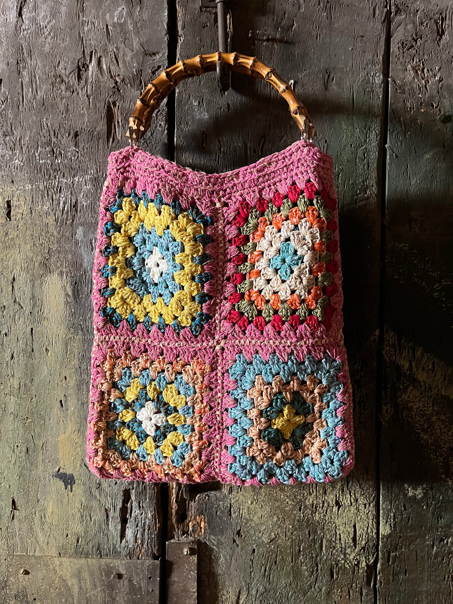 Borsa stopper fatta a mano a uncinetto in cotone di diversi colori lavorato a quadri e manici a gomito in bambù.