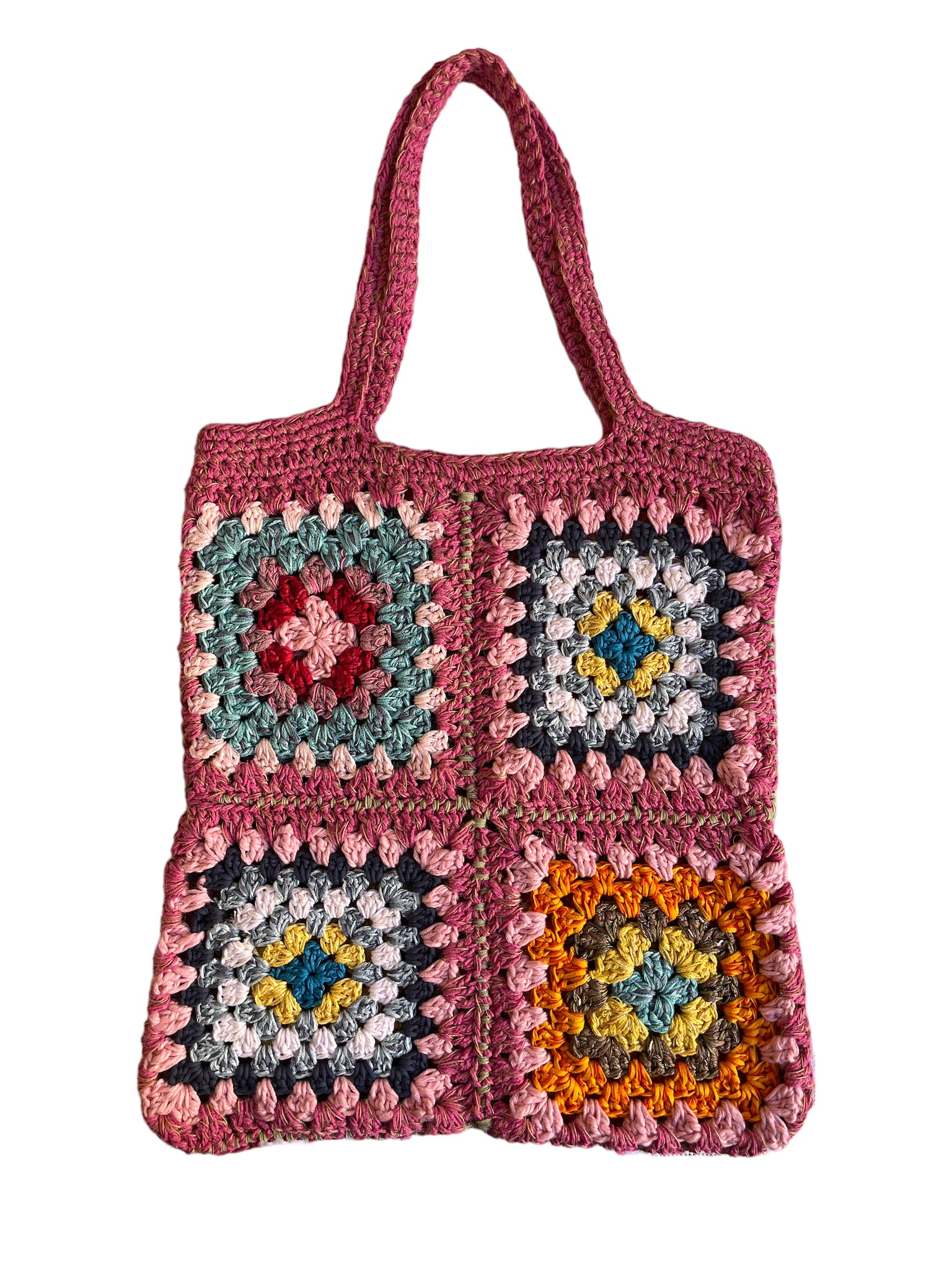 Borsa stopper fatta a mano a uncinetto in cotone di diversi colori lavorato a quadri e manici a spalla in cotone e corda.