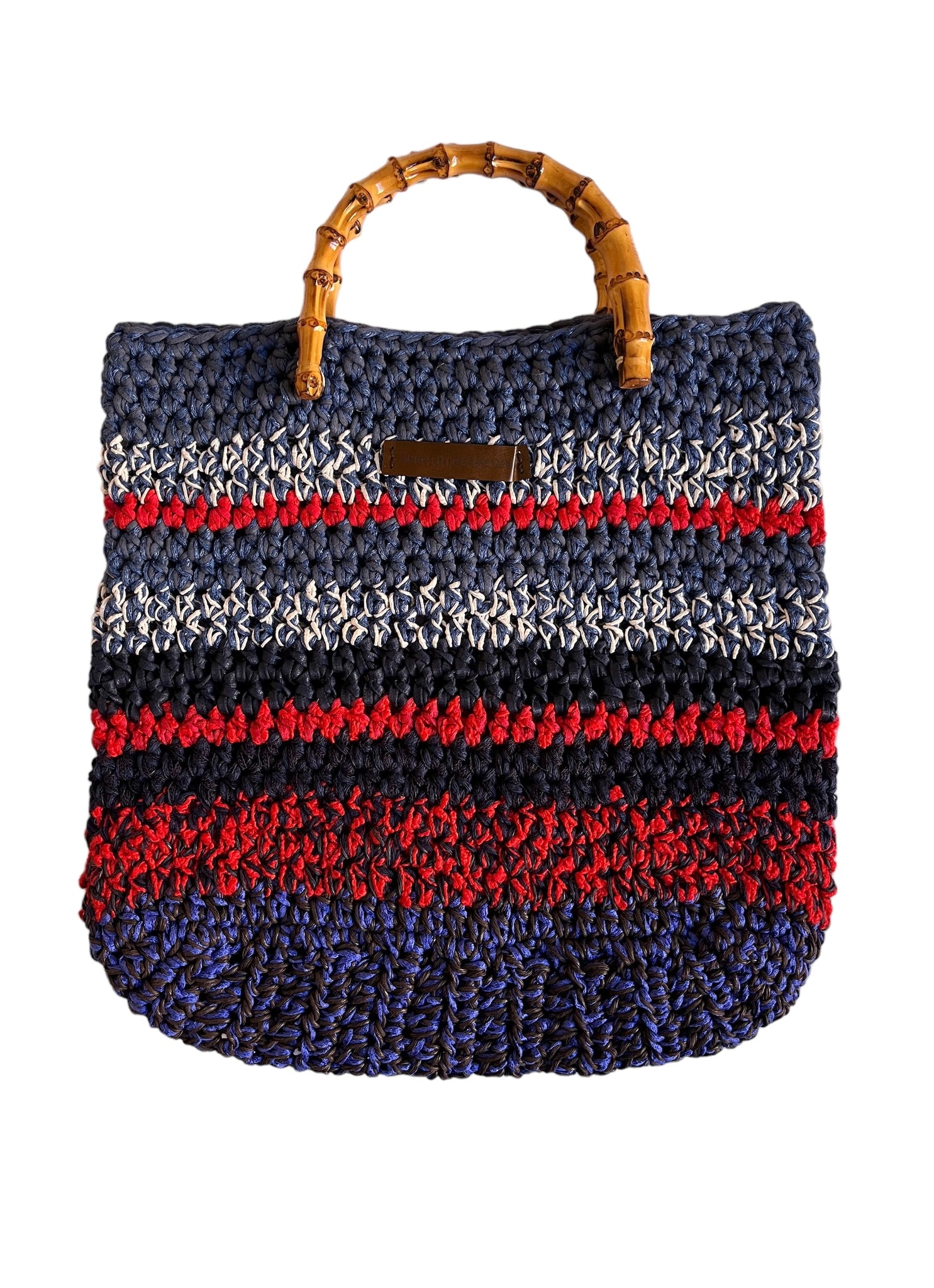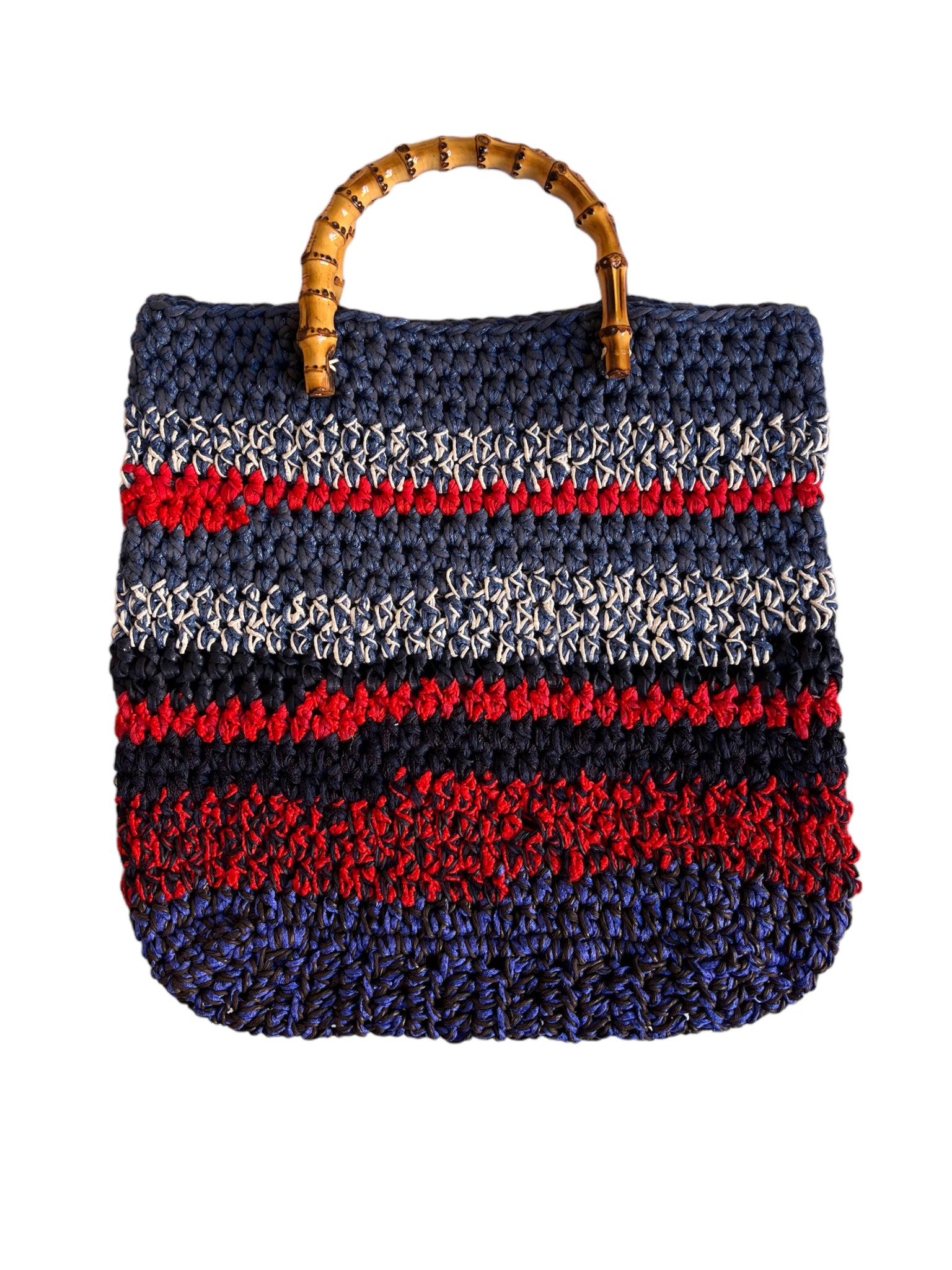 Borsa shopper fatta a mano a uncinetto in cotone e manici al polso in bambù.