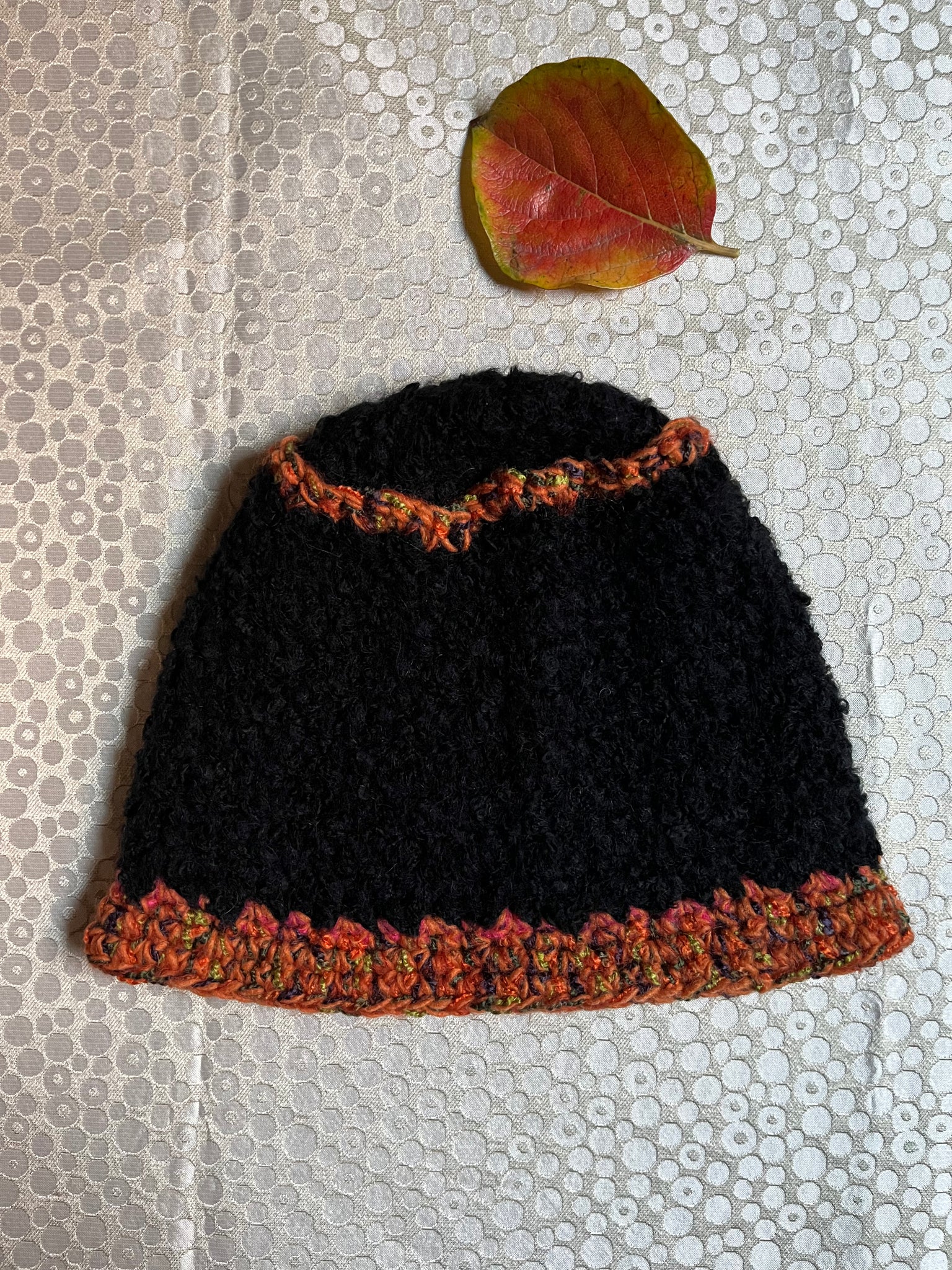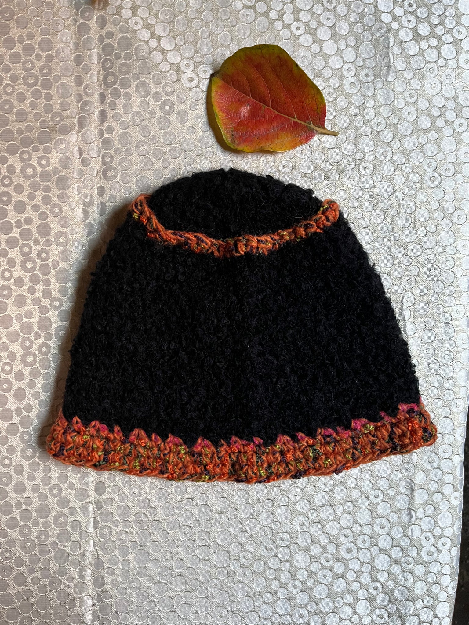 Berretto in lana bouclé nera con dettagli sull’arancio mélange. Fatto a mano a uncinetto.
