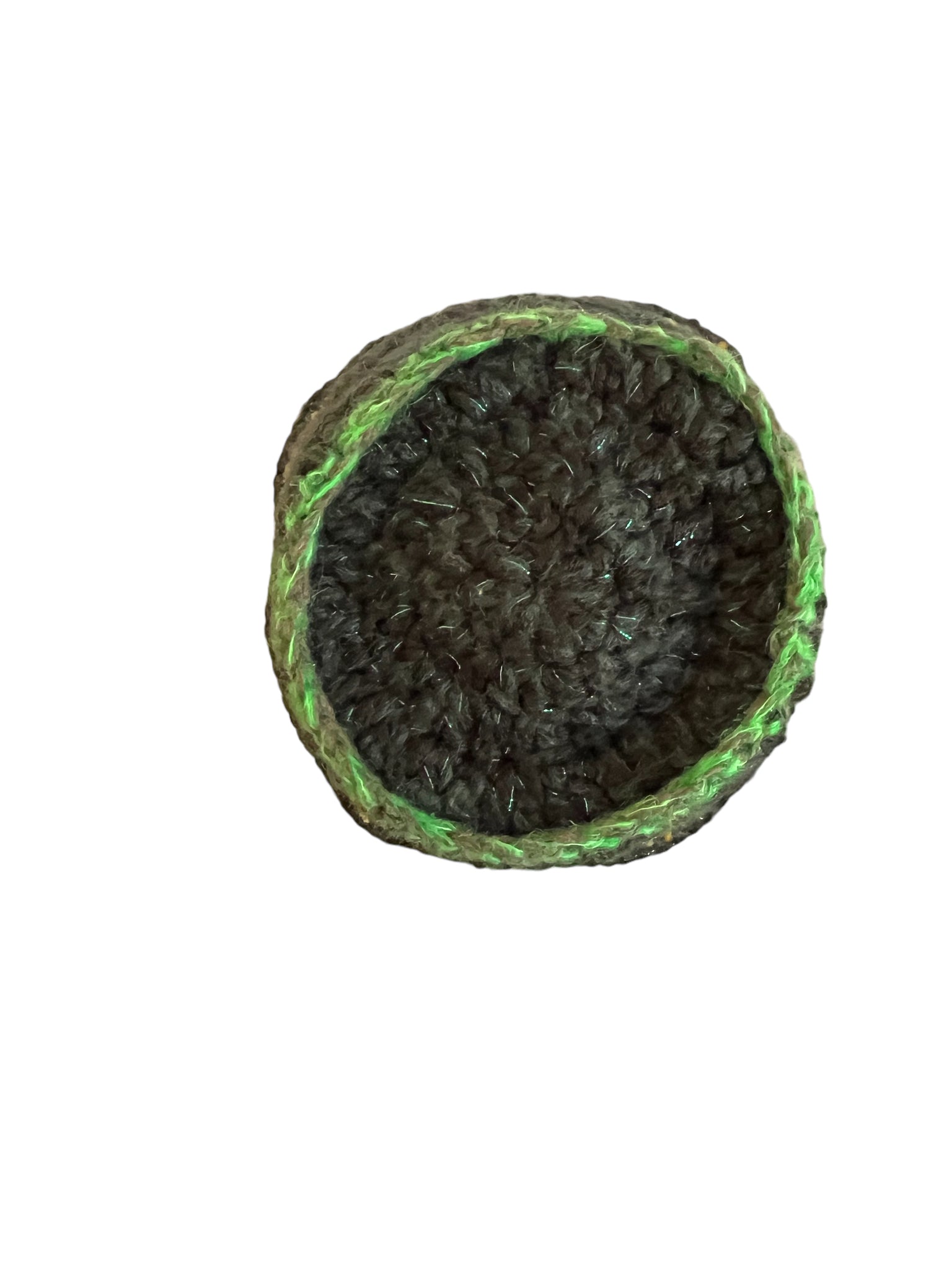 Berretto in lana verde oliva con dettagli in giallo e viola e un filo di lurex verde. Fatto a mano a uncinetto.